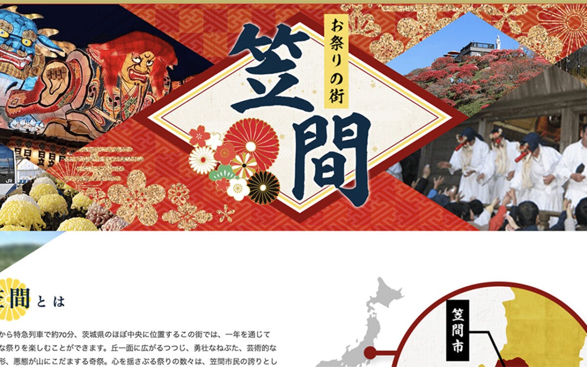 笠間市は一年を通じて様々な祭りが行われており、日本三代稲荷“笠間稲荷神社”や日本遺産の伝統工芸品“笠間焼”など、魅力的な文化が溢れる街です。長年包括連携で活動させていただいた中で制作したコンテンツを活用し、LP(ランディングページ)を制作いたしました。自治体の方々とのディスカッションを通し、現状の分析やコンセプトの設計、さらに発信後の明確な目的を設定。笠間市の魅力を発信していきました。