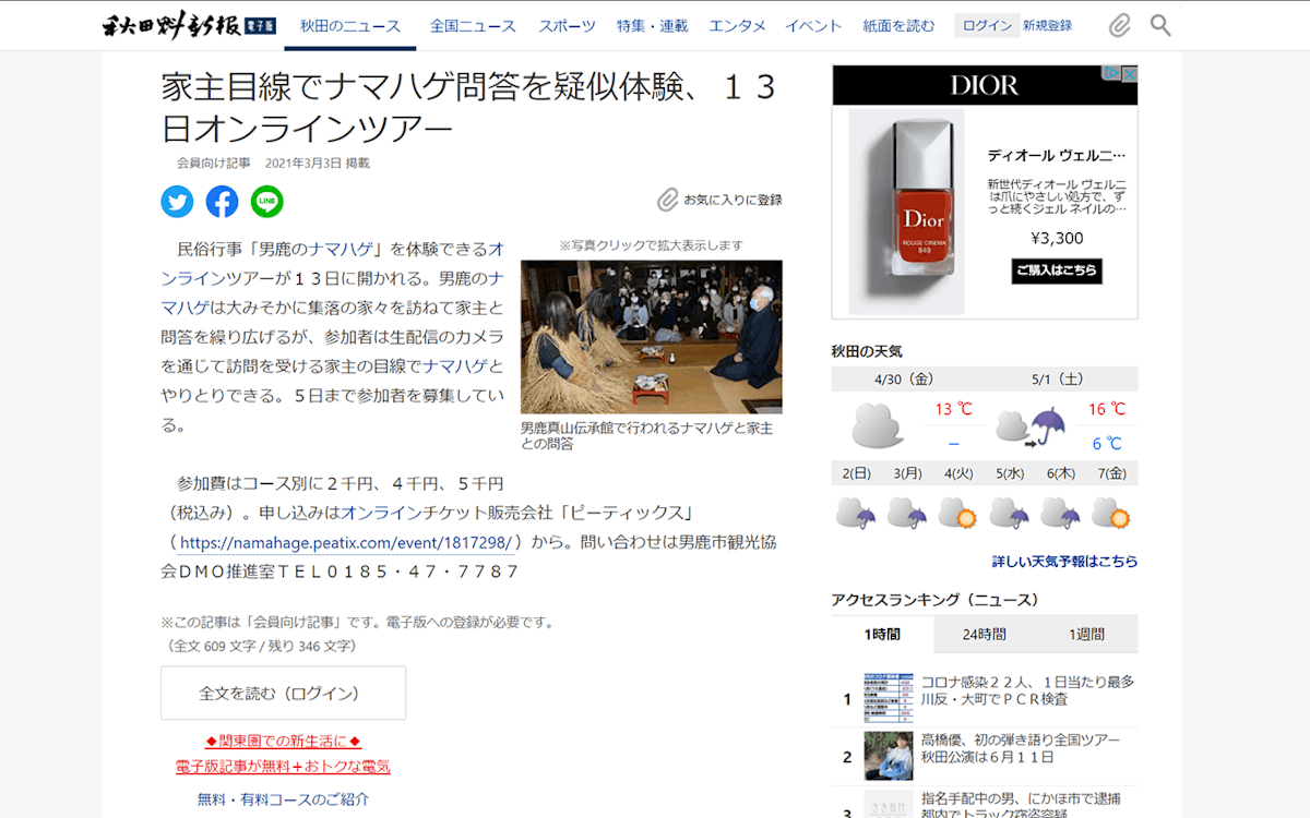 事例として、オマツリジャパン『【オンライン留学ツアーin秋田』 多面なかみさま、男鹿のナマハゲ』をご紹介します。