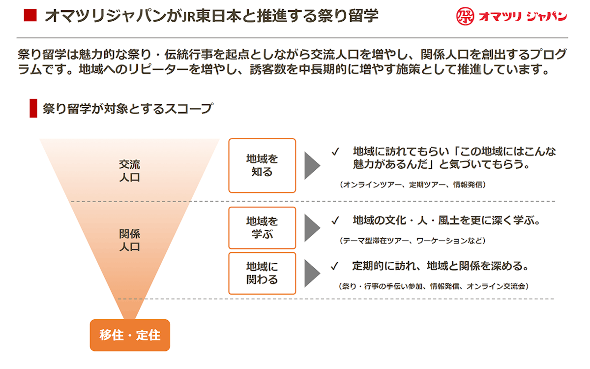 関係人口を創出する施策で大切なのは、歴史や気候、住む人たちの人柄など、地域に関する事柄を知ってもらい、その地域だけの魅力を感じてもらうこと。オマツリジャパンではこの一連の活動に、お祭りが活用できると考えています。